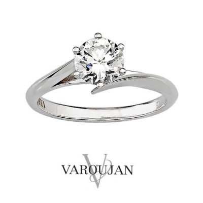 Currently, all round solitaire diamond rings consists of a round diamond set in ring with four or six claws. The Varoujan designed ring has six claws and a band which flares out in opposite direction. The result is a very distinctive and unique design that makes the ring band looks daintier and highlights the centre stone even more.