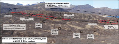 The infill drill holes targeted mineralization at various structural elevations across a portion of gold/silver “envelopes” previously incorporated into a non-43-101 compliant resource estimation. Overall the precious metal-bearing Shumagin vein system has a strike extent of over 1.2 kilometres and a depth extent of approximately 330 metres as outlined by drilling and surface trenching.