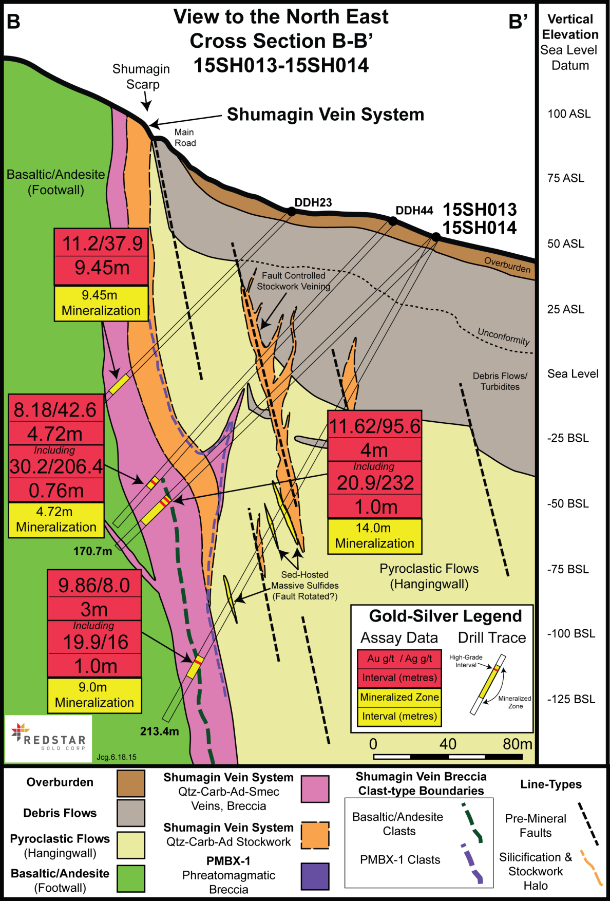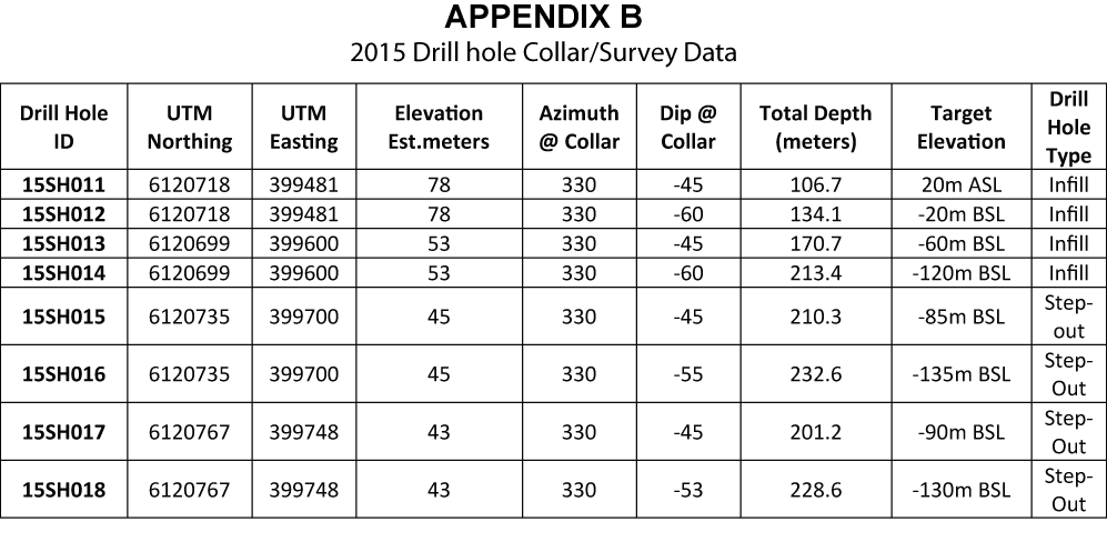 – High-grade gold/silver mineralization has been encountered in drill hole 15SH013 for 4.0 metres grading 11.62 g/t gold and 95.6 g/t silver, including 1.0 metre grading 20.9 g/t gold and 232 g/t silver and 1.0 metre grading 17.45 g/t gold and 122 g/t silver.
