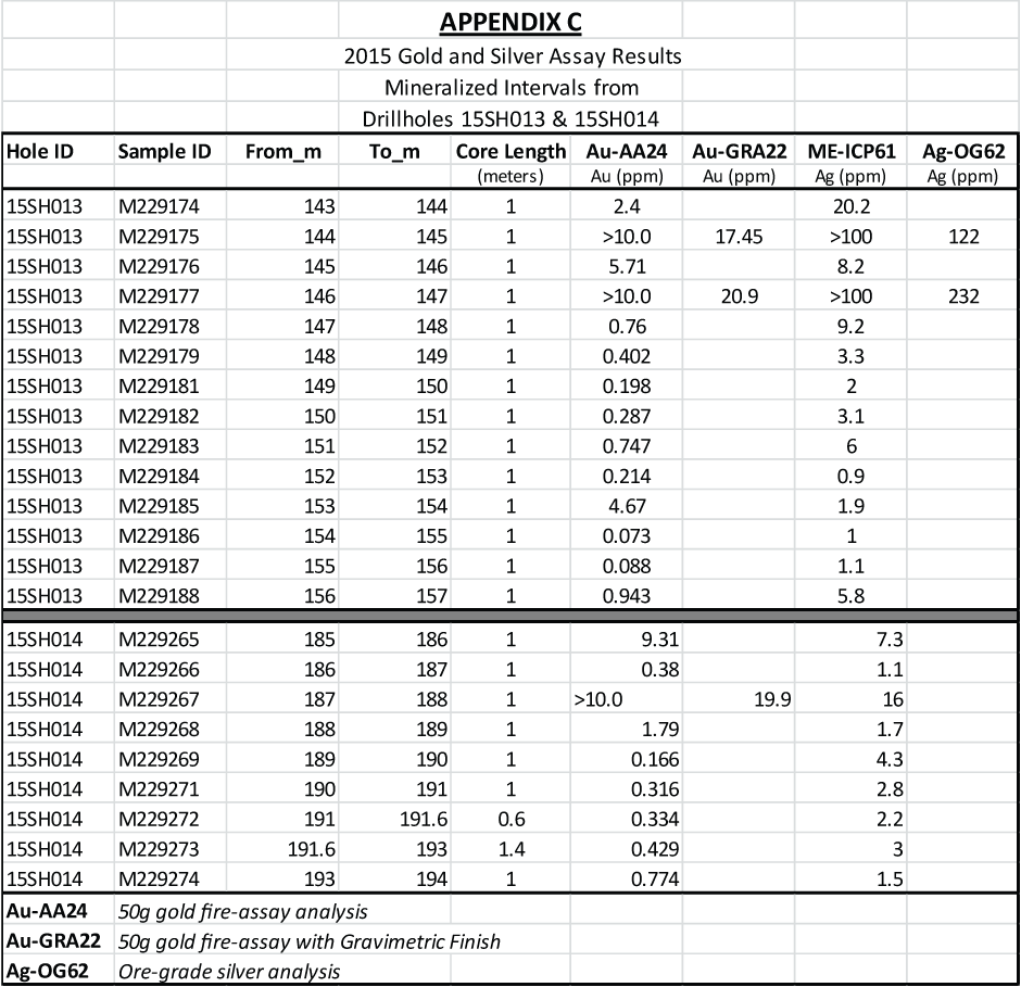 – Drill hole 15SH014 intercepted 3.0 metres grading 9.86 g/t gold and 8.0 g/t silver, including 1.0 metre grading 19.9 g/t gold and 16.0 g/t silver.