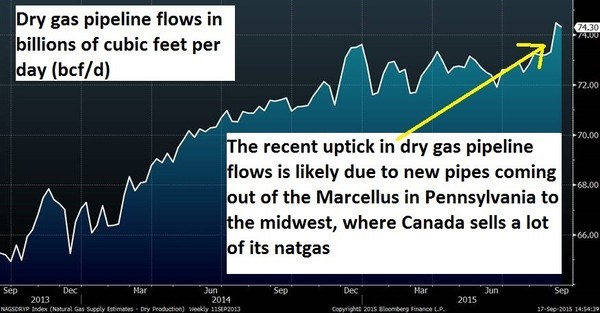 NORTH VANCOUVER, BC / ACCESSWIRE / September 21, 2015 / Many of the leading Canadian natgas/condensate producers have exciting (bullish) short term stock charts–just at a time when one fundamental natgas chart looks ominously bearish. The Big Play for natgas in Canada is the liquids-rich Montney formation on the BC-Alberta border.