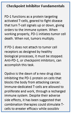 Heat is the first to combine a cancer vaccine with a checkpoint inhibitor for NSCLC, although others are exploring hopes that a multi-based therapy would increase efficacy without bad side effects seen with PD-1 targeted drugs. Research in the last several years points to a synergy between the two modalities: in 2012, peer-reviewed science journal OncoImmunology reported safety and “encouraging clinical activity” with Bristol-Myers Yervoy and a vaccine for prostate cancer. Musings on a resurrection of cancer vaccines, several of which failed during clinical trials, put faith of success on combinations with checkpoint inhibitors. Case in point is GlaxoSmithKline’s (GSK:NYSE) MAGE-A3 vaccine for NSCLC that flopped in Phase III trials, and now the pharma giant thinks combining cancer vaccines with anti-PD-1 therapy may aid in stopping a tumor’s ability to escape detection from the immune system.