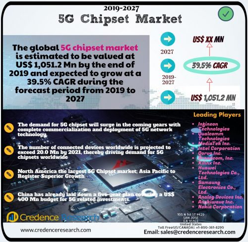 According to a new market research report published by Credence Research, “5G Chipset Market (by IC Type (Radio Frequency Integrated Circuit (RFIC), Application-specific Integrated Circuits (ASIC), Cellular IC, Millimeter Wave IC), by Operating Frequency (Sub-6 GHz, Between 26 and 39 GHz, Above 39 GHz), by Industry Vertical (Consumer Electronics, Industrial Manufacturing, Automotive and Transportation, Energy and Utilities, Healthcare, Retail, and Others (Public Safety, etc.)), by Geography (North America, Europe, Asia Pacific, and Rest of the World)) – Growth, Future Prospects, and Competitive Landscape, 2019 -2027”, the global 5G chipset market is estimated to be valued at US$ 1,051.2 Mn by the end of 2019 and expected to grow at a 39.5% CAGR during the forecast period from 2019 to 2027.