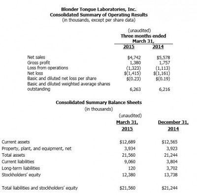 Blonder Tongue Reports First Quarter 2015 Results