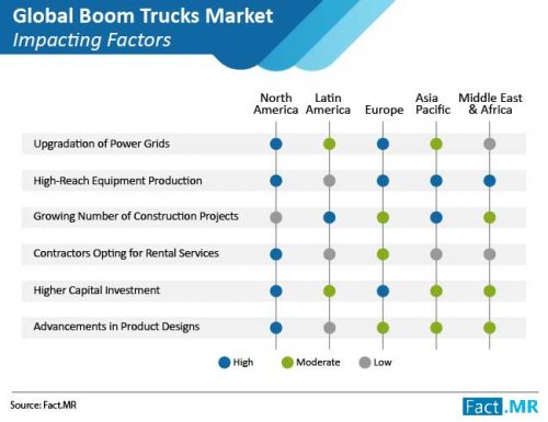 “The global boom trucks market finds optimism mainly due to infrastructure projects and large rental fleets that were once stagnant. Growing expenditure on infrastructure with increasing demand from end use industries including construction, utility, and telecom remains the prominent factors backing the market” says the Fact.MR analyst.
