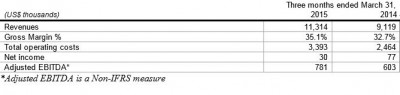 Carmanah management relies on adjusted EBITDA (a non-IFRS measure) to gauge financial performance. In the first quarter of 2015 the Company’s generated $0.8 million of adjusted EBITDA, up from $0.6 million in the same period of 2014. A table reconciling net profit and adjusted EBITDA is included in this release.