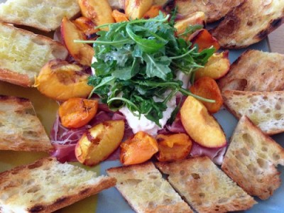 Grilled peaches are not dessert only. Chef Anna Buss of Frog Hollow Farm shares a unique new recipe just in time for summer cookouts — grilled peaches with prosciutto, Burrata cheese and arugula.