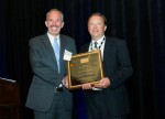 Greg Jackson, President of Columbine Label Company (right), accepts the Eugene Singer Award for Management Excellence from Dan Muenzer, Chairman of the TLMI Board of Directors, during the TLMI Awards Dinner in March 2015.