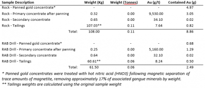 The following table shows the weight and gold content for each concentrate as well as for the tails.