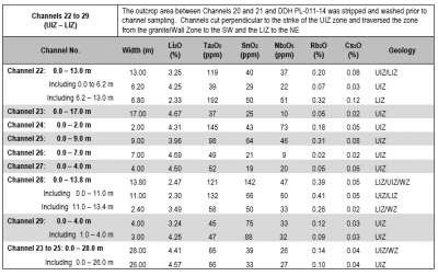 The UIZ represents a high grade lithium zone within the pegmatite and is dominated by “SQUI”, a term used to describe an oriented spodumene + quartz intergrowth after primary petalite, with lesser grey K-feldspar and primary white spodumene in quartz. Phosphate minerals and lithian mica are the common accessory minerals. Channels 23, 24 and 25 with a composite grade of 4.41% Li2O represent a 28 metre section across the UIZ in the north-western part of the exposed pegmatite. Channel 22 is located approximately 105 metres northwest along strike from Channel 9 which was cut in 2013.