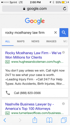The lawsuit explains that Hughes & Coleman placed bids with Google so that when an individual searched “Rocky McElhaney Law Firm” on a mobile device, the popular search engine would display a banner with McElhaney’s firm name at the very top of the search results. This ad for McElhaney’s firm was linked to a Hughes & Coleman website landing page and included a phone number that rings at Hughes & Coleman’s offices. The Court ruled this is a violation of McElhaney’s legal rights. “Clixsy never purchased the rights to use Rocky McElhaney’s name nor did Rocky McElhaney giver permission to Clixsy to use his name, himself or his law firm.”