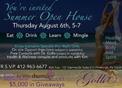 The Summer Open House, on August 6th between 5 PM to 7 PM is open to public at the Golla Center For Plastic Surgery and Medical Spa 107 Gamma Dr # 210 Pittsburgh, PA 15238 (412) 963-6677.