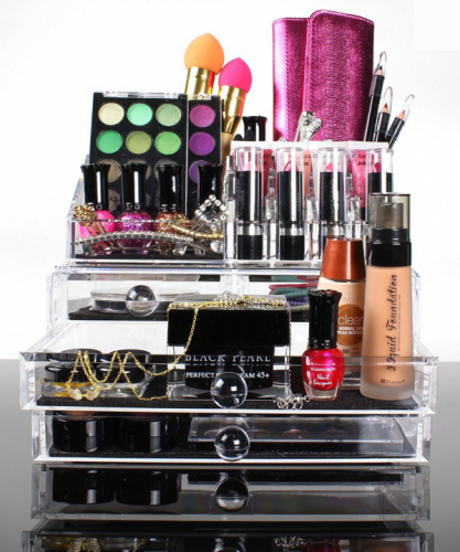Made of a durable, transparent, scratch-resistant acrylic, the Cosmopolitan Collection makeup organizer is attractive and easy to clean. Contained within the organizer, there are four drawers and sixteen other compartments of various shapes and sizes. These can hold a variety of makeup products, such as brushes, lipstick, eye shadow and more.