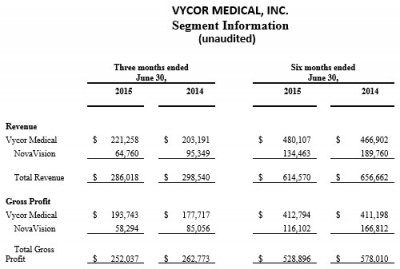 Revenue in the second quarter of 2015 totaled $286,000, a decrease of $13,000 versus the same year-ago quarter. Vycor Medical revenue in the second quarter of 2015 was $221,000, an increase of $18,000 over the same year-ago quarter. NovaVision revenues in the second quarter of 2015 were $65,000, a decrease of $31,000 from the same year-ago quarter. NovaVision revenues were impacted by the delayed launch of the new Internet-delivered therapy suite, which was commercially launched on June 25, 2015. In addition, the decrease in total NovaVision revenues was partly attributed to the impact of foreign exchange differences in the translation of revenues from NovaVision’s European subsidiaries.