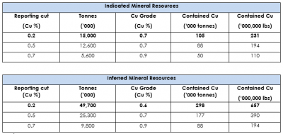 –Inferred Resources of 49.7 million tonnes at 0.6% Cu containing 657MIbs pounds (298,000 tonnes) of copper at a 0.2% copper cut-off grade (refer Table 1).