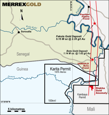Merrex was granted the Authorization for Exploration for the 100 km2 Karita permit area in Guinea in March, 2015. The Karita permit area is 100% owned by Merrex, not within the area of influence of the Merrex -Iamgold Siribaya joint venture, and hosts a significant piece of the Feloka-Boto-Diakha trend. It is contiguous south of IAMGOLD’s Boto deposit and north of the Diakha discovery zone and also hosts extensive artisanal workings, also prominent at the Diakha discovery zone.